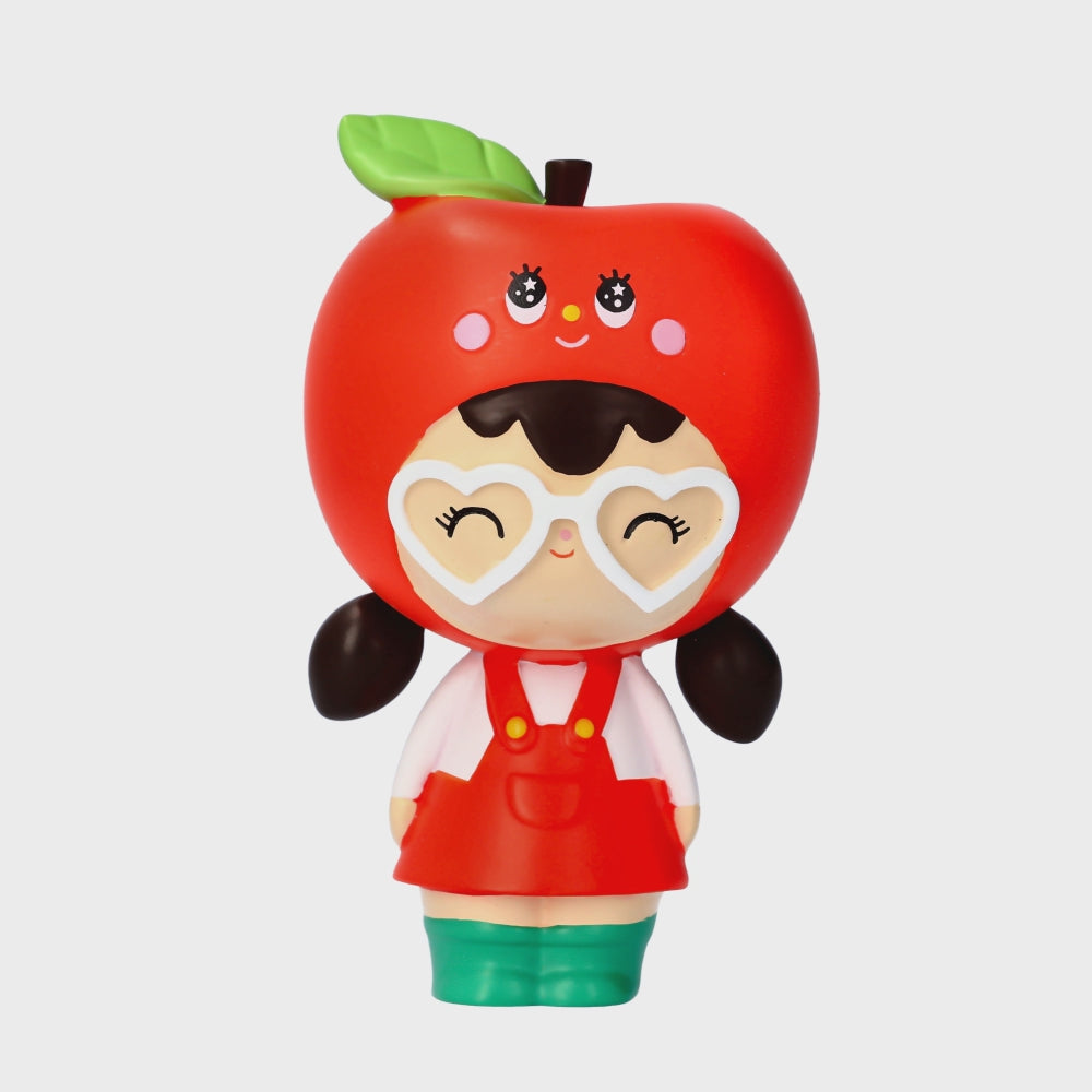 ArchiveThank You Momiji doll: red dress, heart glasses, apple hat, green boots, big smile; collectible character with secret message. — Momiji Doll